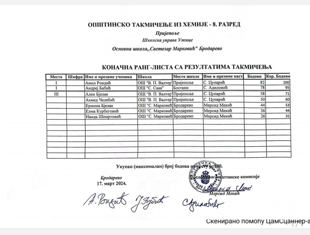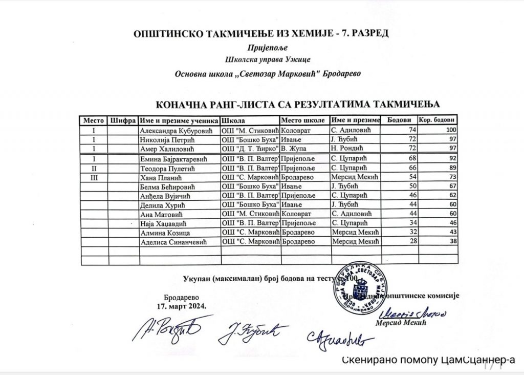 РЕЗУЛТАТИ ШКОЛСКОГ ТАКМИЧЕЊА ИЗ ХЕМИЈЕ
