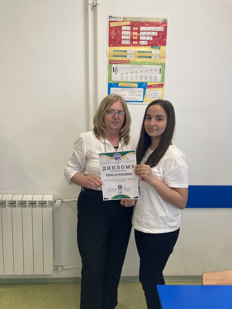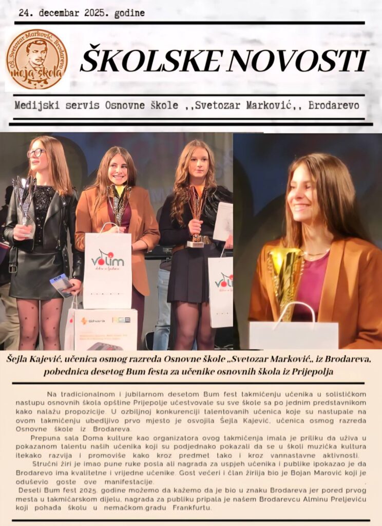 Шејла Кајевић, ученица осмог разреда наше школе, освојила је прво место на љубиларном 10. Бум фесту, такмичењу ученика основних школа општине Пријепоље у категорији солистичког наступа. Својим запаженим извођењем одушевила је стручни жири и публику, потврдивши висок ниво музичке културе, посвећености и квалитетног рада који се негују у нашој школи. Школа упућује искрене честитке Шејли и жели јој много успеха у даљем музичком развоју.