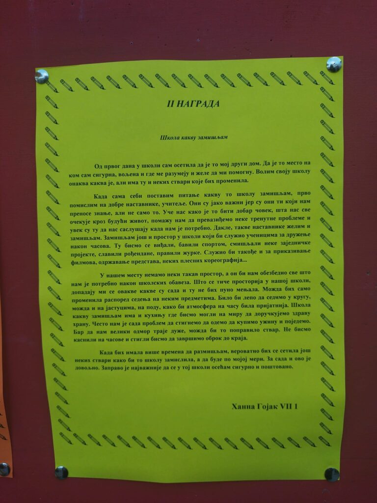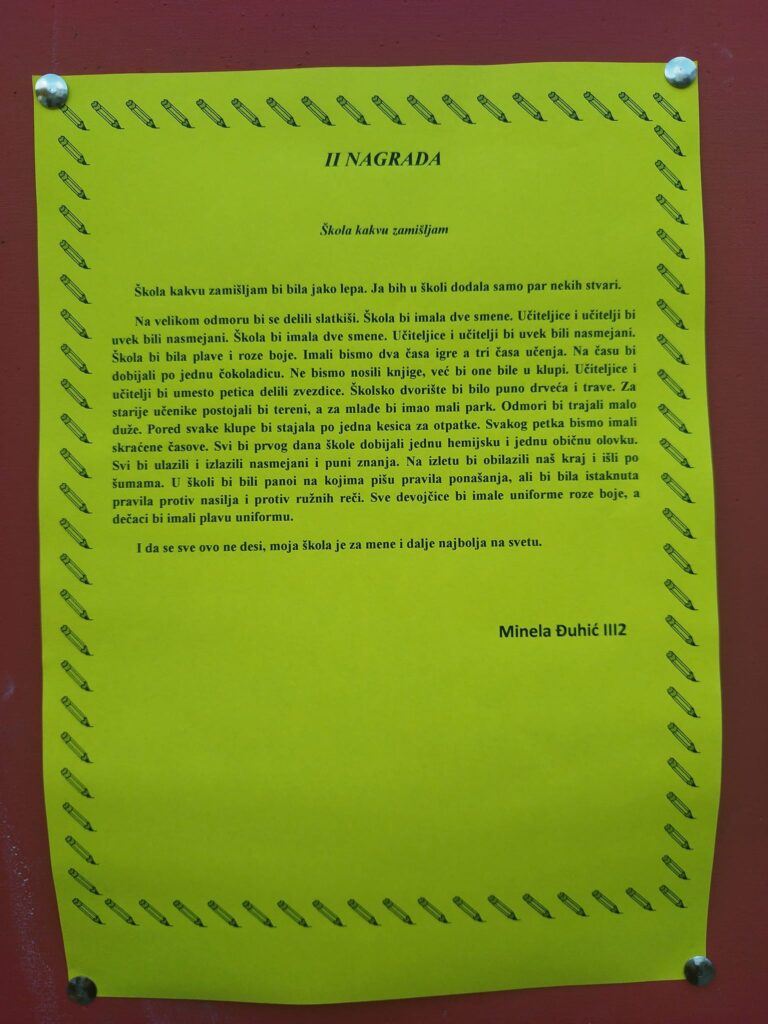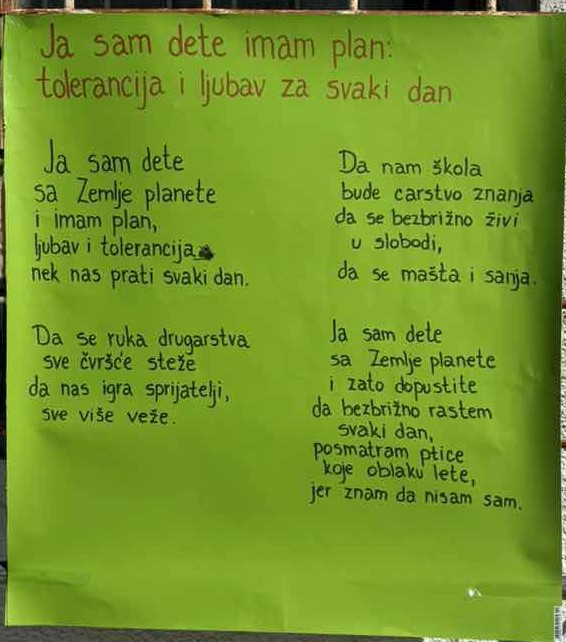 Svi su se potrudili da daju svoj doprinos. I, na kraju su bili ponosni što su učestvovali u nečemu ovako lepom i pozitivnom. Nadamo se da će deca poslužiti kao primer da se udruženim snagama može puno toga. Svi imamo zajednički cilj. Da nam prostor u kom boravimo bude prijatan za život. A sami odlučujemo o tome. Poruka akcije je jasna a to je da se malim koracima ide ka vrhu, uz podršku ljudi koji nas okružuju.