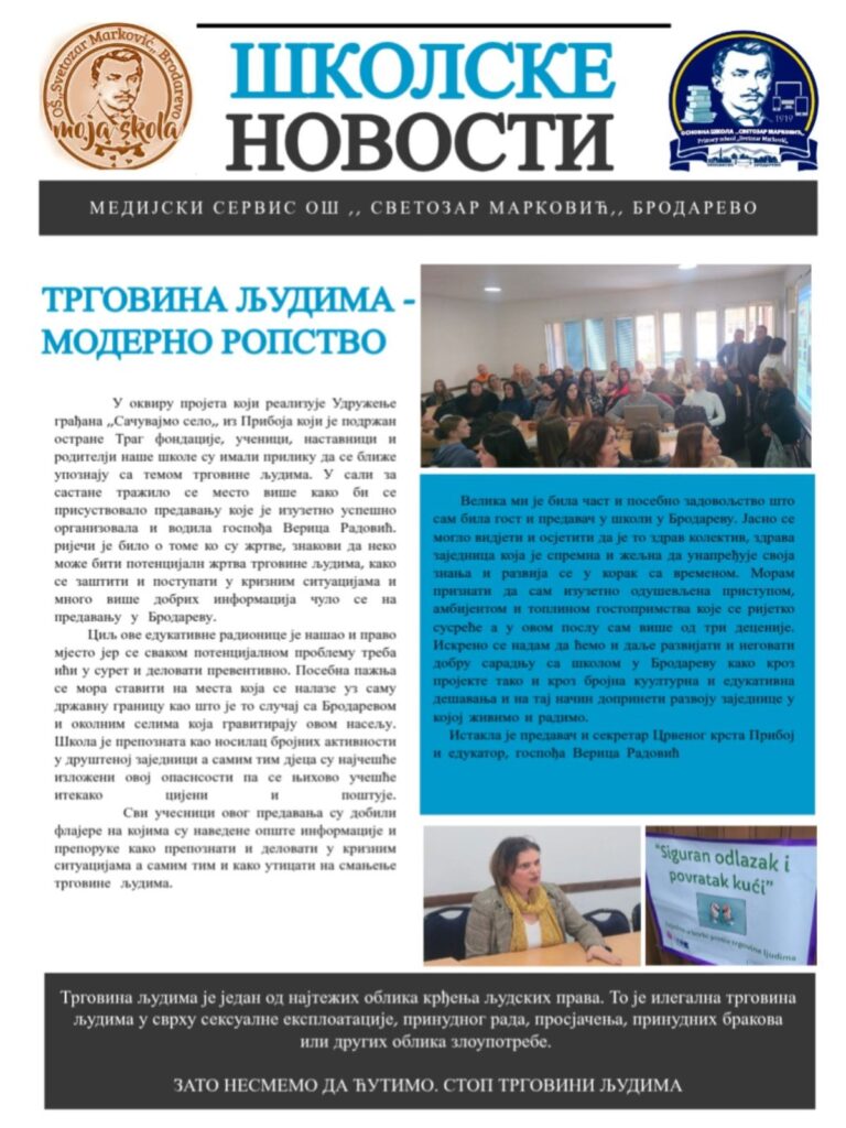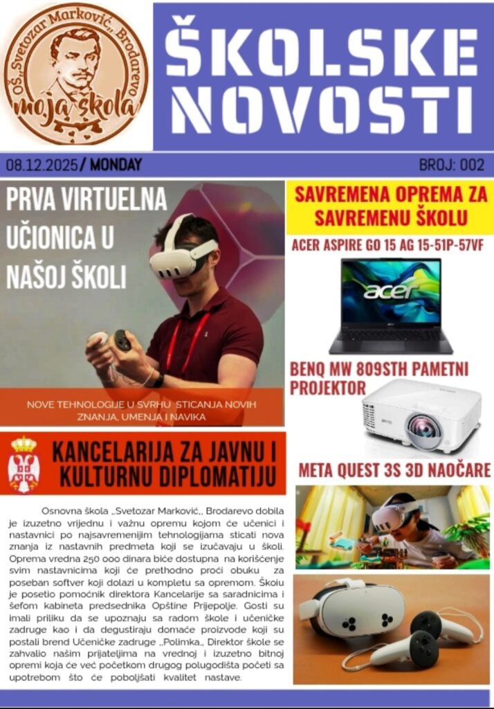 Ученици и наставници Основне школе ,,Светозар Марковић“ из Бродарева добили су савремену компјутерску опрему од стране Министарства просвете науке и технолошког развоја Републике Србије на чему им се посебно захваљујемо.